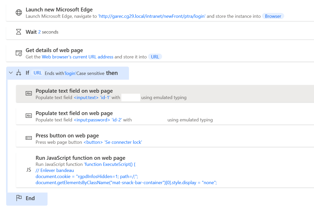 Il peut arriver (surtout lors des tests) que l'on soit déjà connectés afin de poursuivre l'automatisation même dans un statut connecté, on vérifie l'URL. Si on est sur la page de connexion, l'URL de la page se termine par "login" on remplit alors les informations de connexion. Si on est redirigé automatiquement sur le tableau de bord, l'URL change et ne se termine plus par "login". Les étapes sont ignorées.